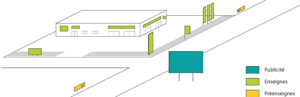 Pré-enseigne : une pré-enseigne correspond à toute inscription, forme ou image indiquant la proximité d’un local ou terrain, où s’exerce une activité.