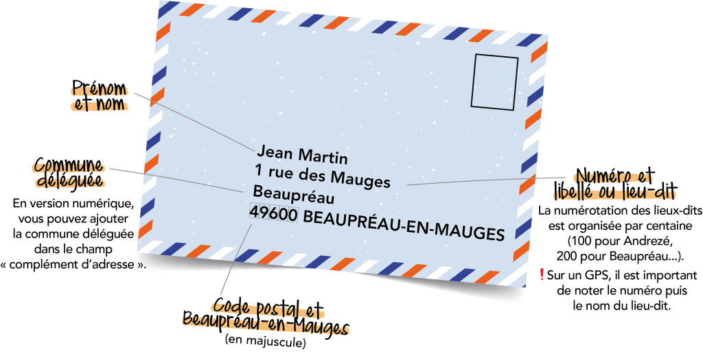 Rédiger correctement son adresse est essentiel pour que vos courriers ou vos colis soient correctement distribués. Voici quelques conseils pratiques pour mettre en forme vos adresses. La numérotation des lieux-dits est organisée par centaine (100 pour Andrezé, 200 pour Beaupréau…). Sur un GPS, il est important de noter le numéro avant le nom du lieu-dit pour être sûr de retrouver l’adresse en question. En version numérique, vous pouvez ajouter la commune déléguée dans le champ « complément d’adresse ».